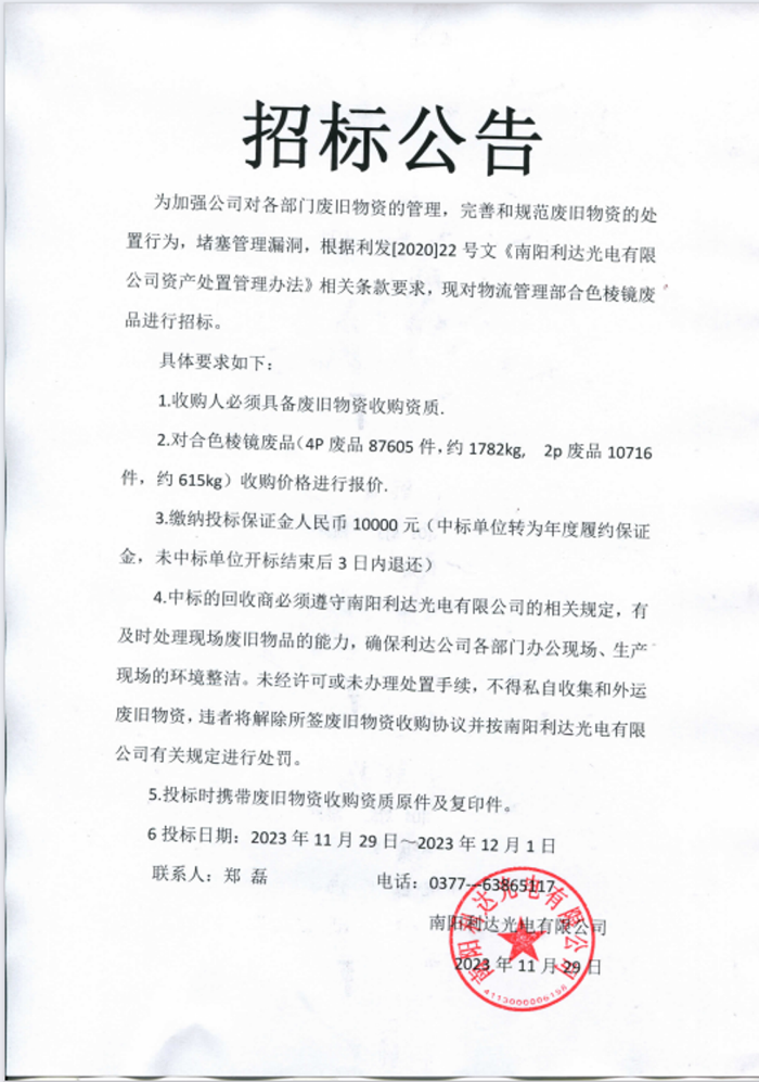 招標公告(合色棱鏡)廢品招標
